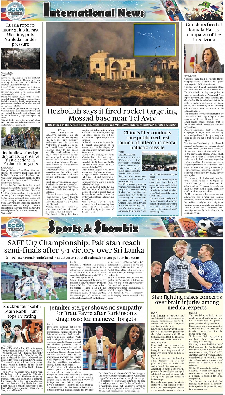 Daily Soon Times Page: 4 September 26, 2024 Daily soon times today's ePaper leading English national newspaper from Islamabad, Sargodha, Karachi, Pakistan << First << 4 >> Last >> Page 1Page 2Page 3Page 4 × Daily Soon Times 1.23.4 1.23.4 4