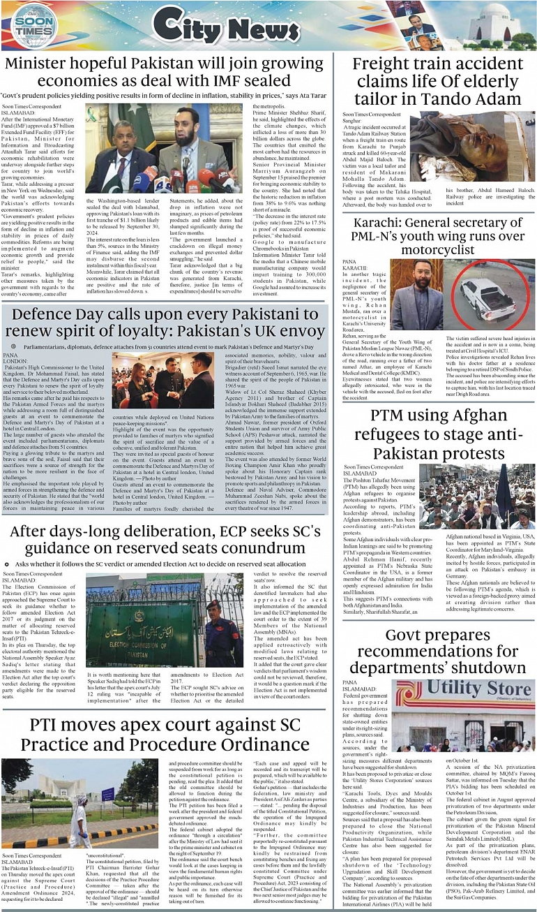 Daily Soon Times Page: 3 September 27, 2024 Daily soon times today's ePaper leading English national newspaper from Islamabad, Sargodha, Karachi, Pakistan << First << 3 >> Last >> Page 1Page 2Page 3Page 4 × Daily Soon Times 1k23k4 1k23k4 3k