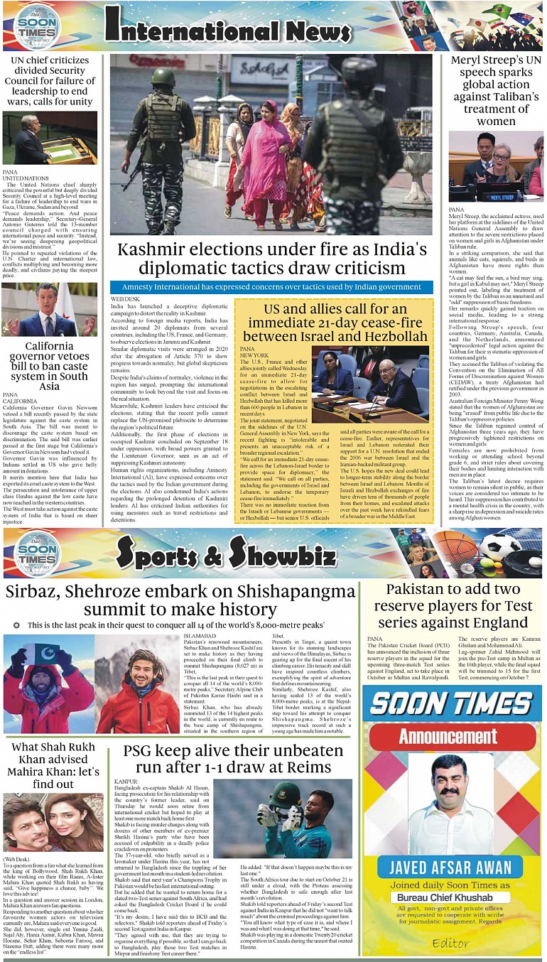 Daily Soon Times Page: 4 September 27, 2024 Daily soon times today's ePaper leading English national newspaper from Islamabad, Sargodha, Karachi, Pakistan << First << 4 >> Last >> Page 1Page 2Page 3Page 4 × Daily Soon Times 1k23k4 1k23k4 4