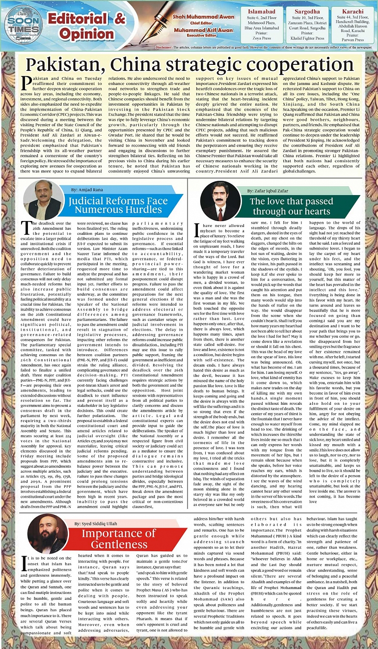 Daily Soon Times Page: 2 October 16, 2024 Daily Soon Times today's ePaper leading English national newspaper from Islamabad, Sargodha, Karachi, Pakistan << First << 2 >> Last >> Page 1Page 2Page 3Page 4 × Daily Soon Times 1234 1234 2