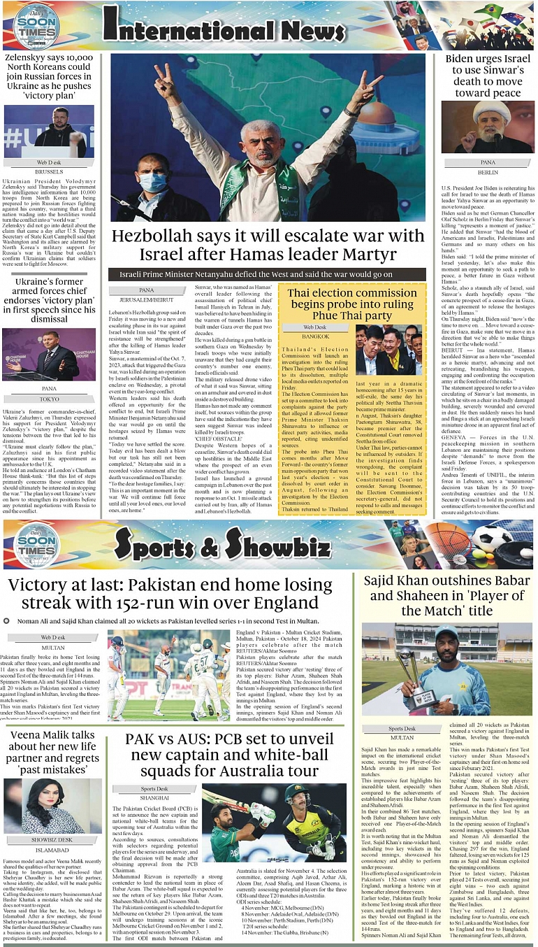 Daily Soon Times Page: 4 October 19, 2024 Daily Soon Times today's ePaper leading English national newspaper from Islamabad, Sargodha, Karachi, Pakistan << First << 4 >> Last >> Page 1Page 2Page 3Page 4 × Daily Soon Times 1K23K4k 1K23K4k 4k