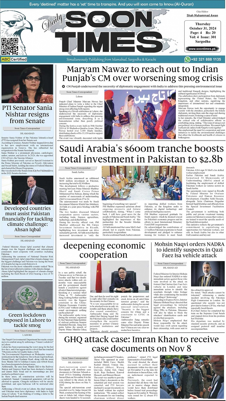Daily Soon Times October 31, 2024 Daily Soon Times today's ePaper leading English national newspaper from Islamabad, Sargodha, Karachi, Pakistan << First << 1 >> Last >> Page 1Page 2Page 3Page 4 × Daily Soon Times 1234 1234 1
