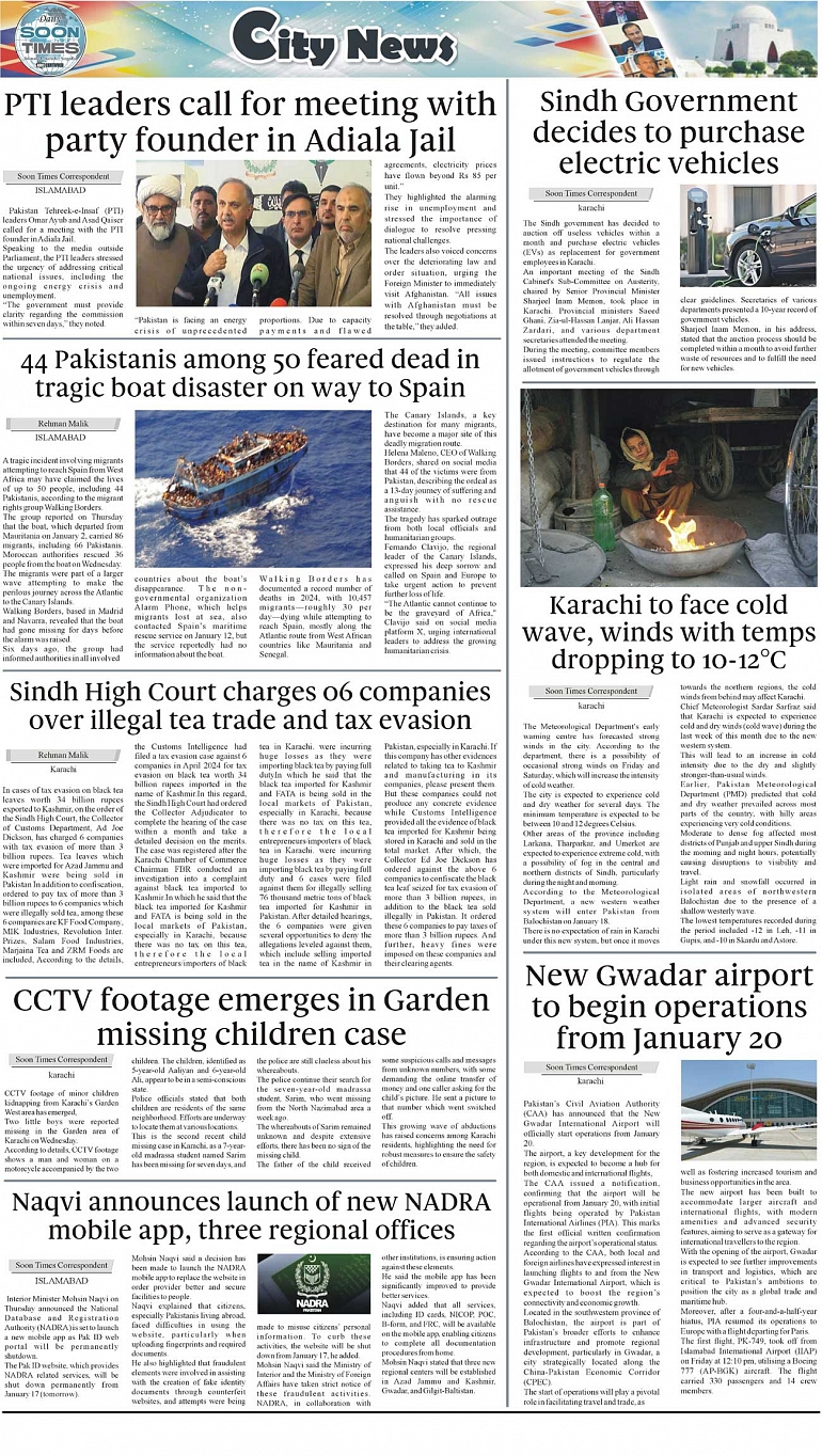 Daily Soon Times Page: 3 January 17, 2025 Daily Soon Times today's ePaper leading English national newspaper from Islamabad, Sargodha, Karachi, Pakistan << First << 3 >> Last >> Page 1Page 2Page 3Page 4 × Daily Soon Times 1k23k4 1k23k4 3k