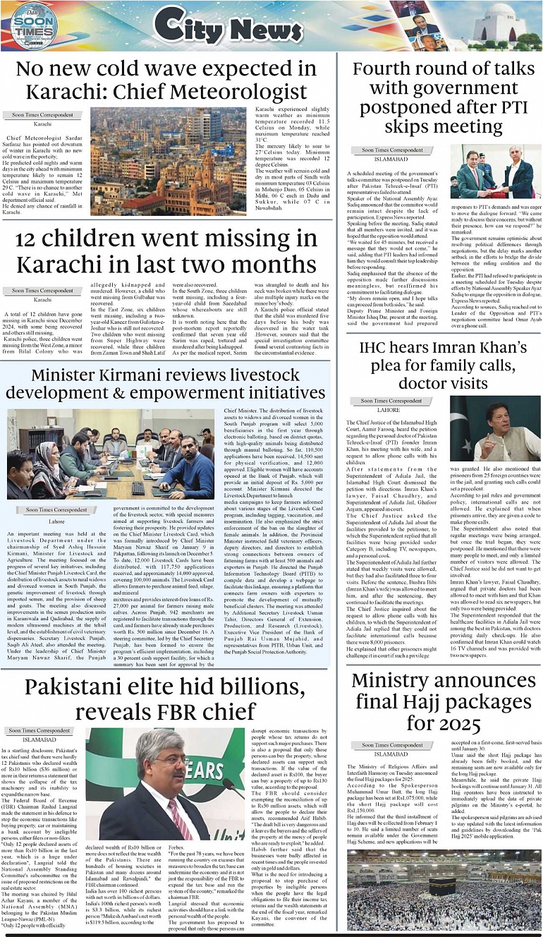 Daily Soon Times Page: 3 January 29, 2025 Daily Soon Times today's ePaper leading English national newspaper from Islamabad, Sargodha, Karachi, Pakistan << First << 3 >> Last >> Page 1Page 2Page 3Page 4 × Daily Soon Times 1k23k4 1k23k4 3k