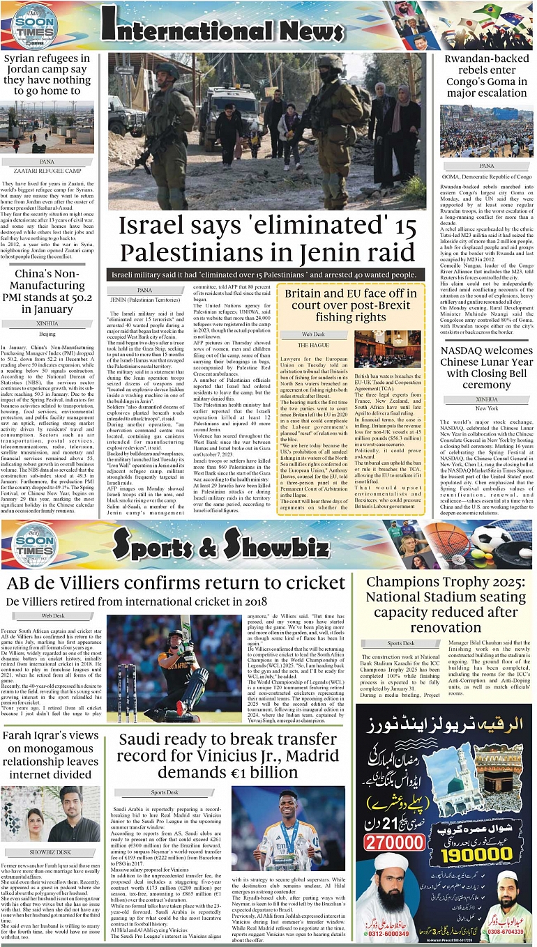 Daily Soon Times Page: 4 January 29, 2025 Daily Soon Times today's ePaper leading English national newspaper from Islamabad, Sargodha, Karachi, Pakistan << First << 4 >> Last >> Page 1Page 2Page 3Page 4 × Daily Soon Times 1k23k4 1k23k4 4