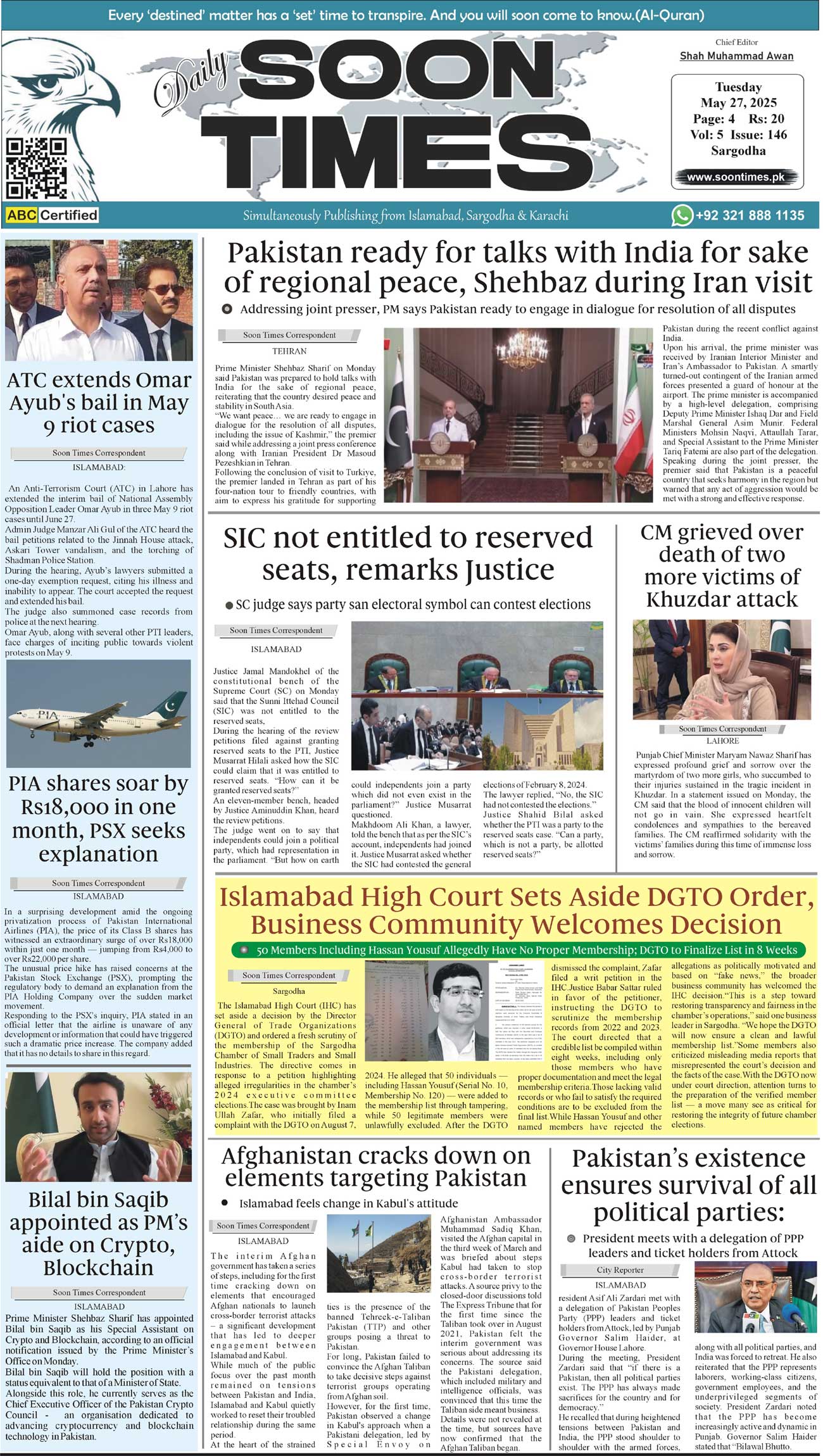 Daily Soon Times May 27, 2025 Daily Soon Times today's ePaper leading English national newspaper from Islamabad, Sargodha, Karachi, Pakistan << First << 1 >> Last >> Page 1Page 2Page 3Page 4 × Daily Soon Times 123.4 123.4 1