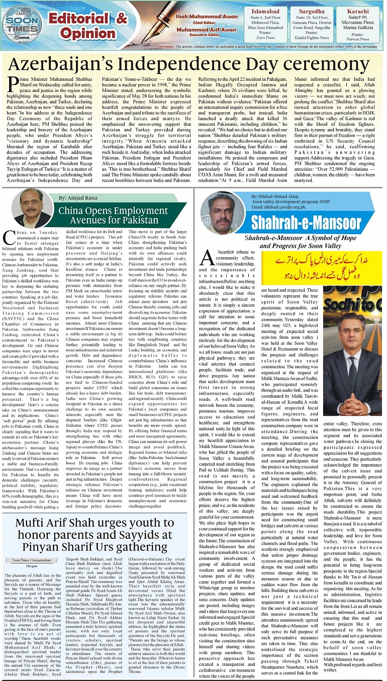 Daily Soon Times Page: 2 May 29, 2025 Daily Soon Times today's ePaper leading English national newspaper from Islamabad, Sargodha, Karachi, Pakistan << First << 2 >> Last >> Page 1Page 2Page 3Page 4 × Daily Soon Times 1234 1234 2