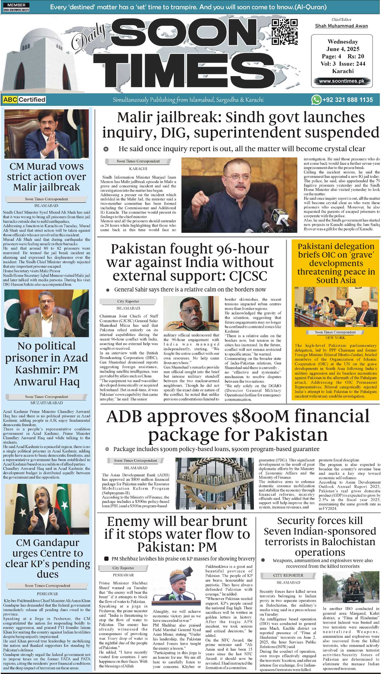 Daily Soon Times today's ePaper leading English national newspaper from Islamabad, Sargodha, Karachi, Pakistan