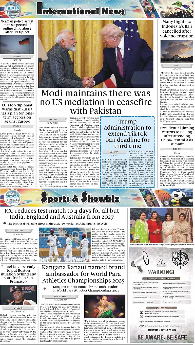 Daily Soon Times Page: 4 June 19, 2025 Daily Soon Times today's ePaper leading English national newspaper from Islamabad, Sargodha, Karachi, Pakistan << First << 4 >> Last >> Page 1Page 2Page 3Page 4 × Daily Soon Times 1.234 1.234 4