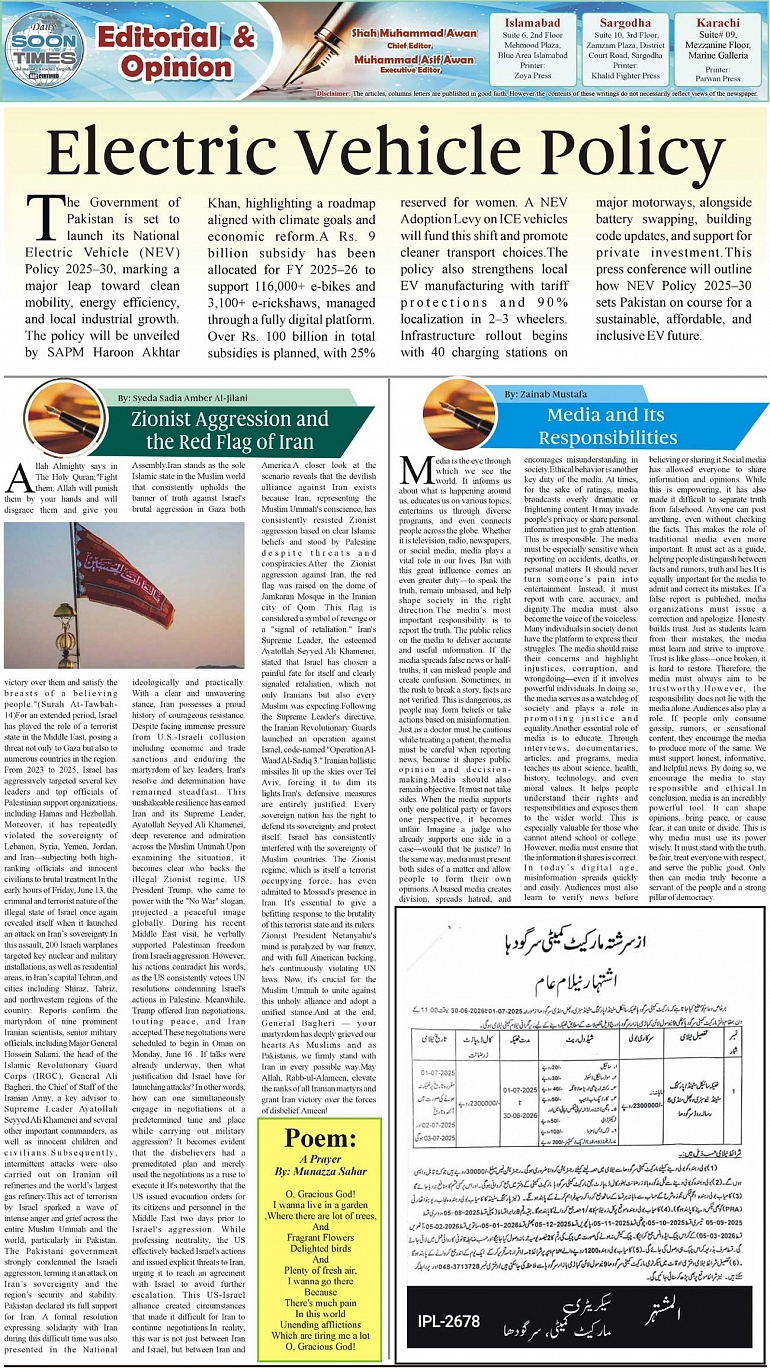 Daily Soon Times Page: 2 June 19, 2025 Daily Soon Times today's ePaper leading English national newspaper from Islamabad, Sargodha, Karachi, Pakistan << First << 2 >> Last >> Page 1Page 2Page 3Page 4 × Daily Soon Times 1k23k4 1k23k4 2