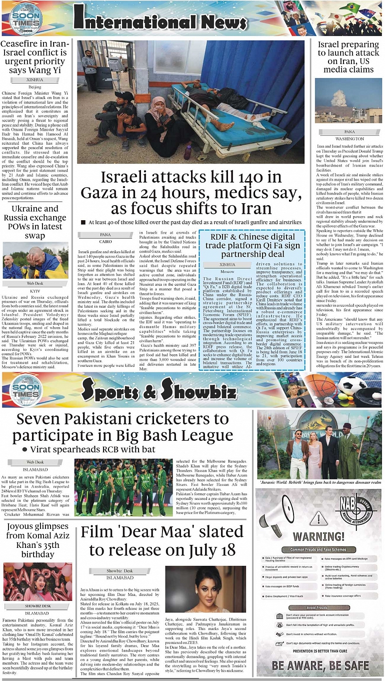 Daily Soon Times Page: 4 June 20, 2025 Daily Soon Times today's ePaper leading English national newspaper from Islamabad, Sargodha, Karachi, Pakistan << First << 4 >> Last >> Page 1Page 2Page 3Page 4 × Daily Soon Times 1234 1234 4