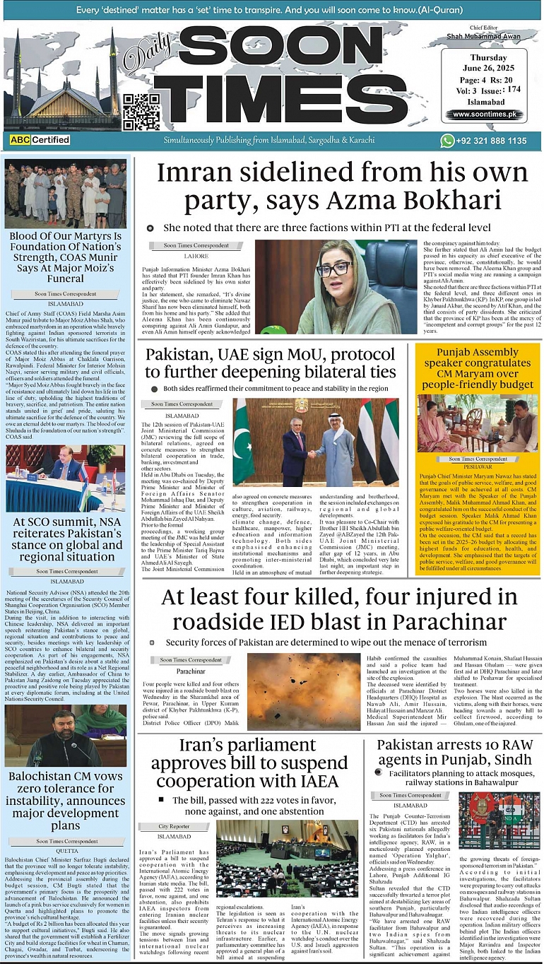Daily Soon Times June 26, 2025 Daily Soon Times today's ePaper leading English national newspaper from Islamabad, Sargodha, Karachi, Pakistan << First << 1 >> Last >> Page 1Page 2Page 3Page 4 × Daily Soon Times 1..234 1..234 1..