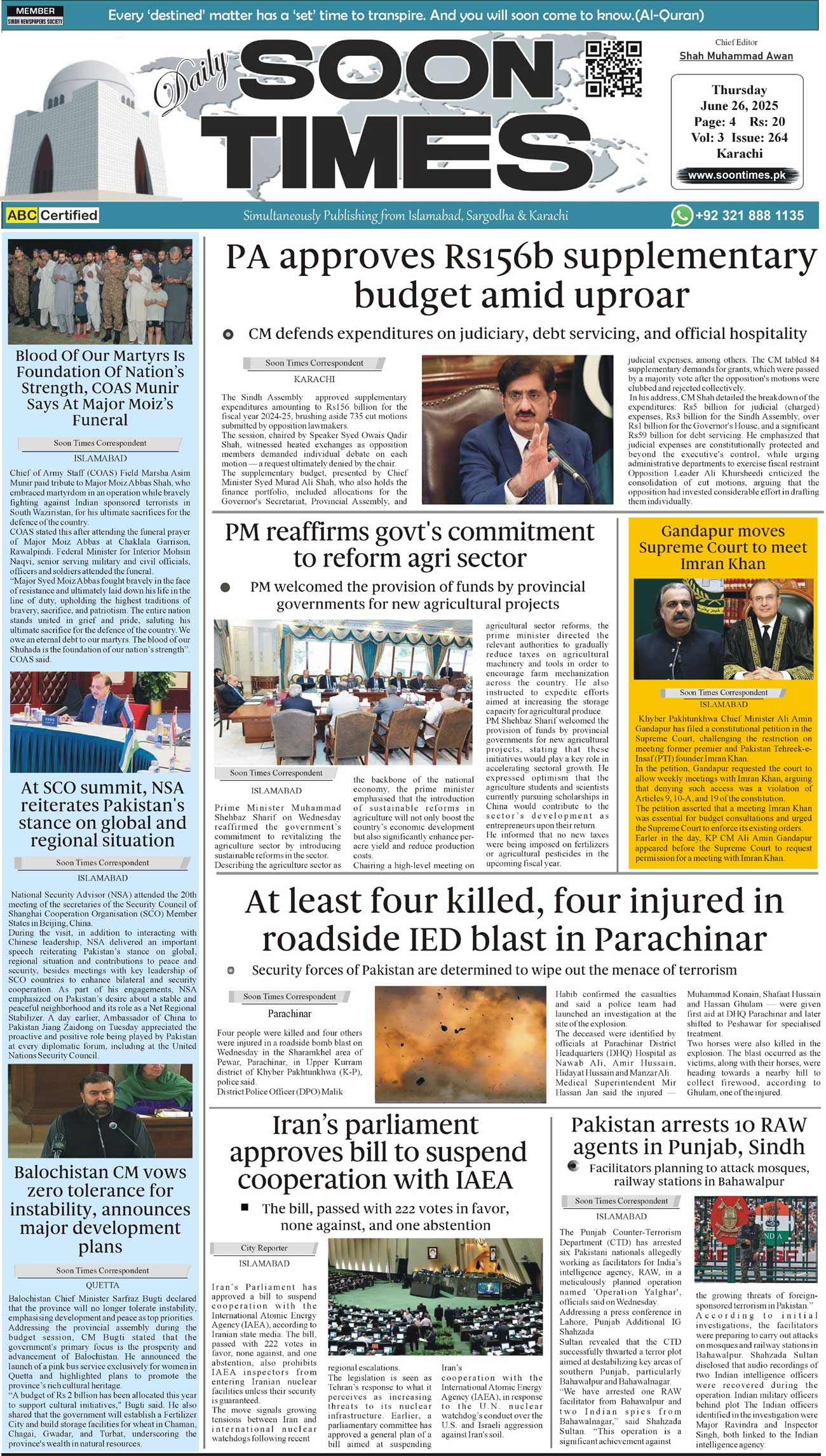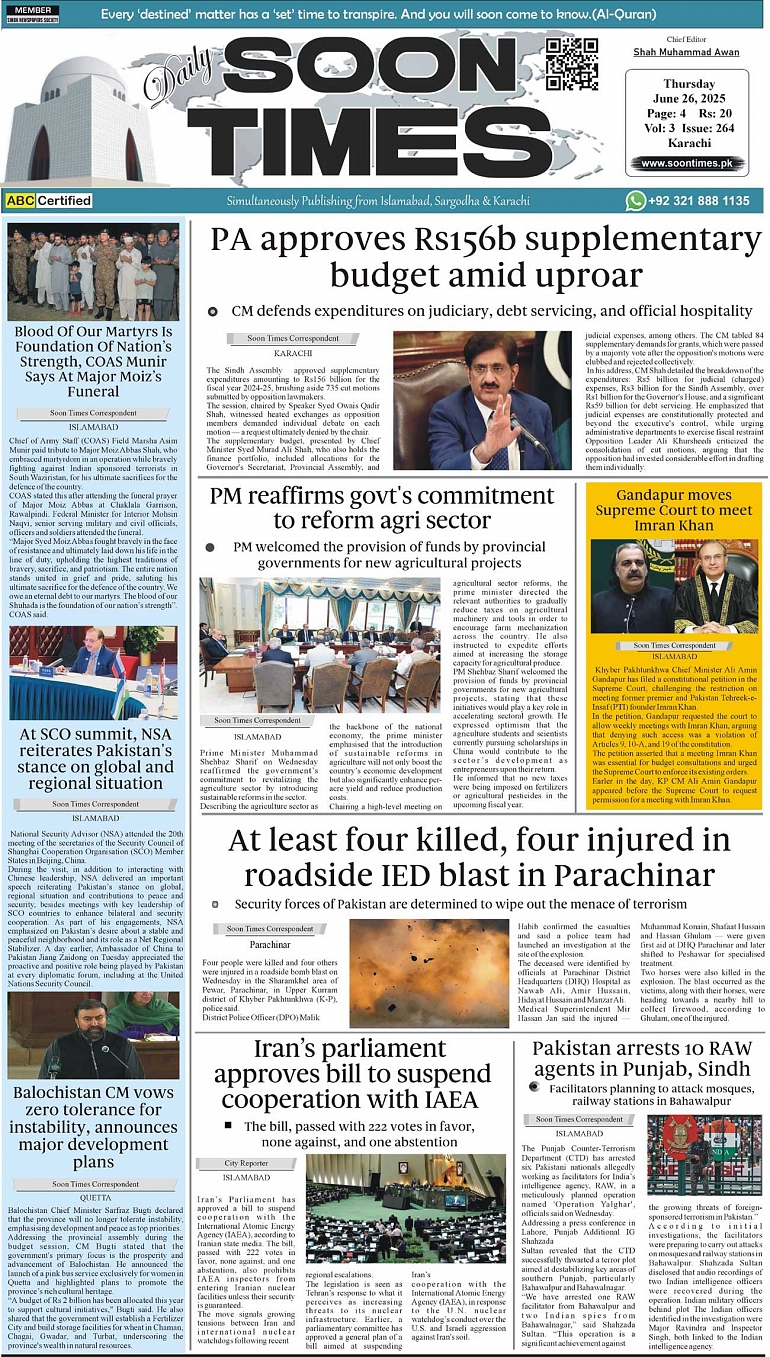 Daily Soon Times today's ePaper leading English national newspaper from Islamabad, Sargodha, Karachi, Pakistan