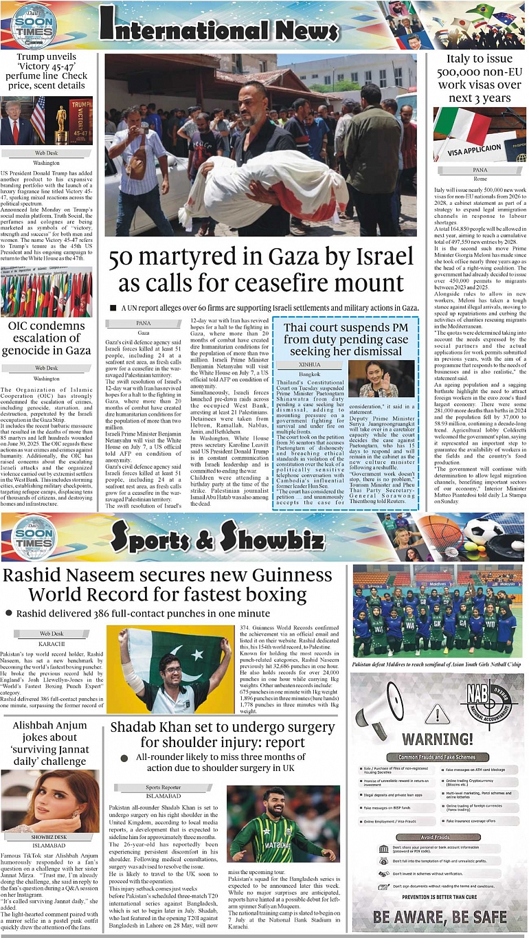 Daily Soon Times Page: 4 July 02, 2025 Daily Soon Times today's ePaper leading English national newspaper from Islamabad, Sargodha, Karachi, Pakistan << First << 4 >> Last >> Page 1Page 2Page 3Page 4 × Daily Soon Times 1...234 1...234 4
