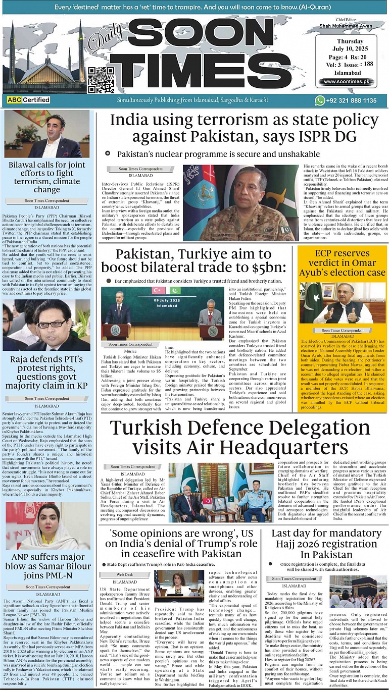 Daily Soon Times July 10, 2025 Daily Soon Times today's ePaper leading English national newspaper from Islamabad, Sargodha, Karachi, Pakistan << First << 1 >> Last >> Page 1Page 2Page 3Page 4 × Daily Soon Times 1.234 1.234 1.