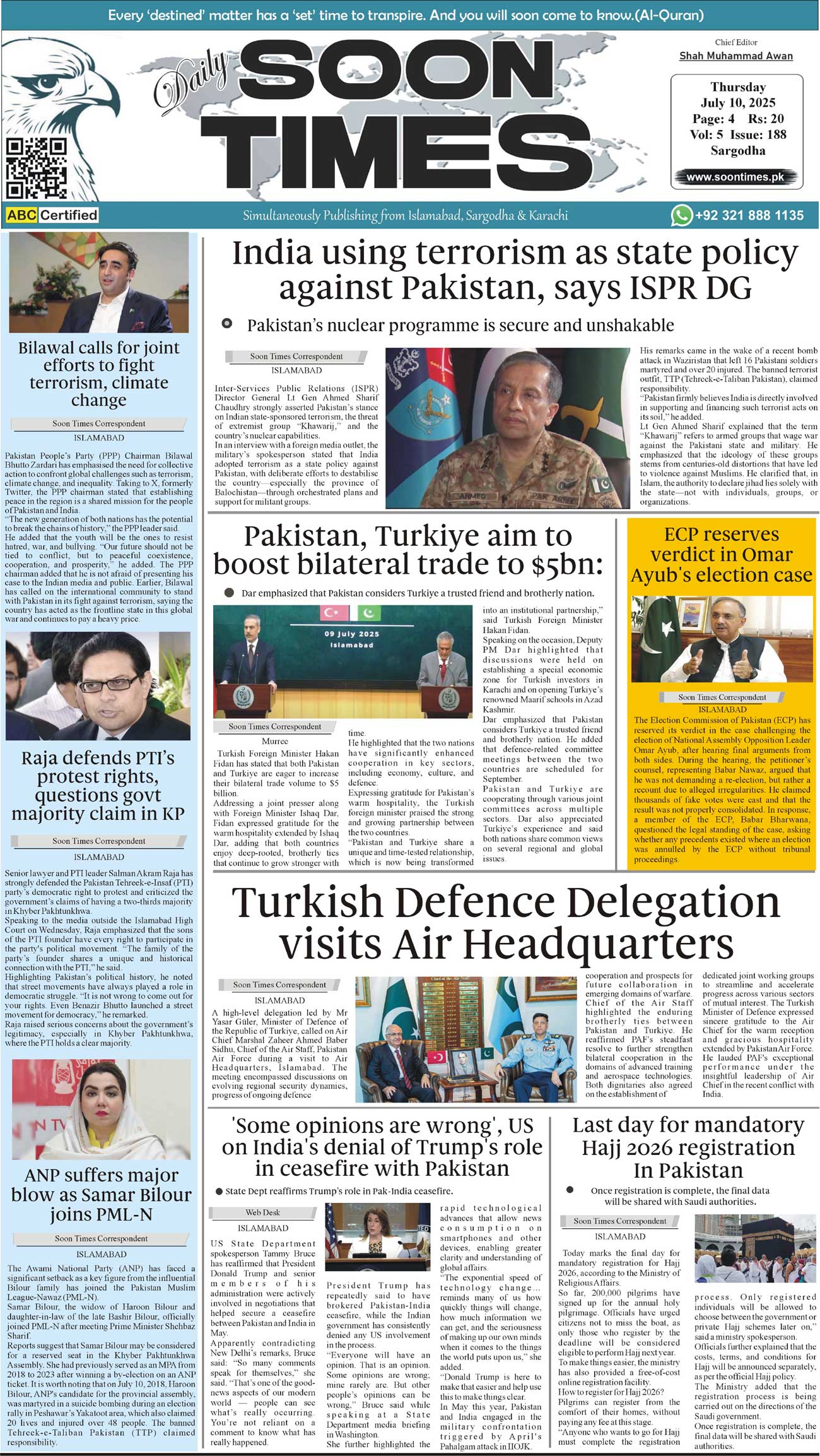 Daily Soon Times July 10, 2025 Daily Soon Times today's ePaper leading English national newspaper from Islamabad, Sargodha, Karachi, Pakistan << First << 1 >> Last >> Page 1Page 2Page 3Page 4 × Daily Soon Times 1234 1234 1