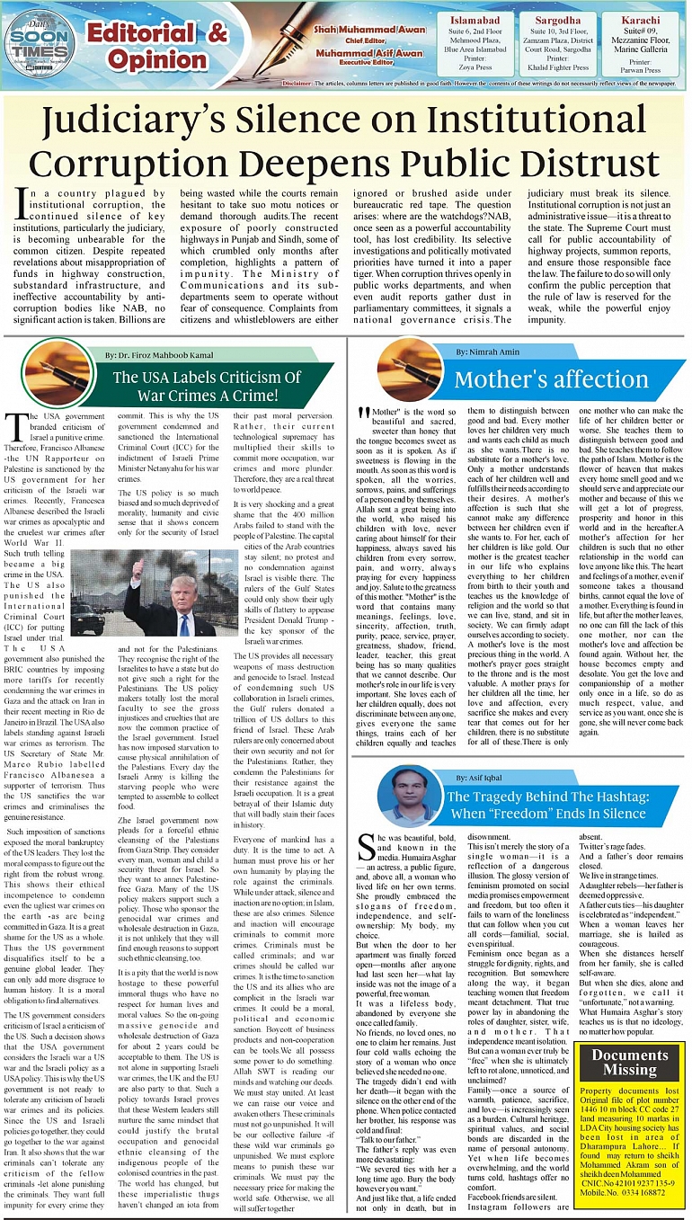 Daily Soon Times Page: 2 July 11, 2025 Daily Soon Times today's ePaper leading English national newspaper from Islamabad, Sargodha, Karachi, Pakistan << First << 2 >> Last >> Page 1Page 2Page 3Page 4 × Daily Soon Times 1k2k3k4 1k2k3k4 2k
