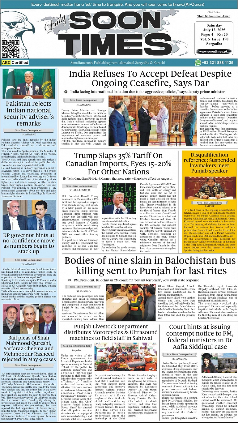 Daily Soon Times July 12, 2025 Daily Soon Times today's ePaper leading English national newspaper from Islamabad, Sargodha, Karachi, Pakistan << First << 1 >> Last >> Page 1Page 2Page 3Page 4 × Daily Soon Times 1234 1234 1