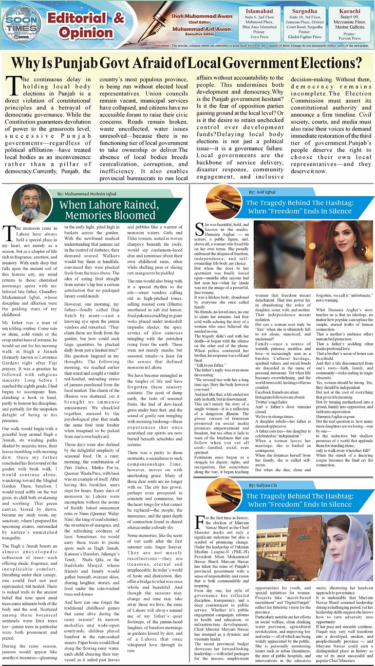 Daily Soon Times Page: 2 July 12, 2025 Daily Soon Times today's ePaper leading English national newspaper from Islamabad, Sargodha, Karachi, Pakistan << First << 2 >> Last >> Page 1Page 2Page 3Page 4 × Daily Soon Times 1234 1234 2