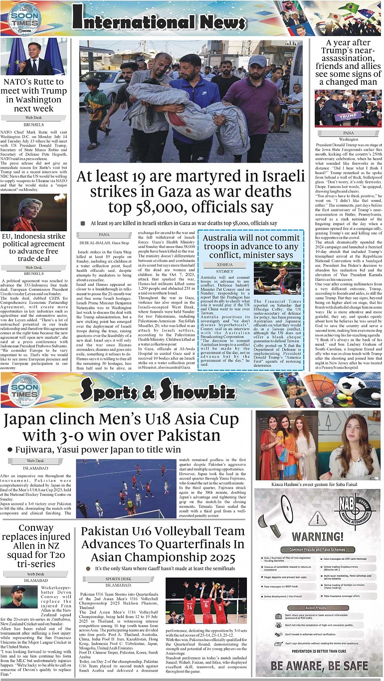 Daily Soon Times Page: 4 July 14, 2025 Daily Soon Times today's ePaper leading English national newspaper from Islamabad, Sargodha, Karachi, Pakistan << First << 4 >> Last >> Page 1Page 2Page 3Page 4 × Daily Soon Times 1k23k4 1k23k4 4