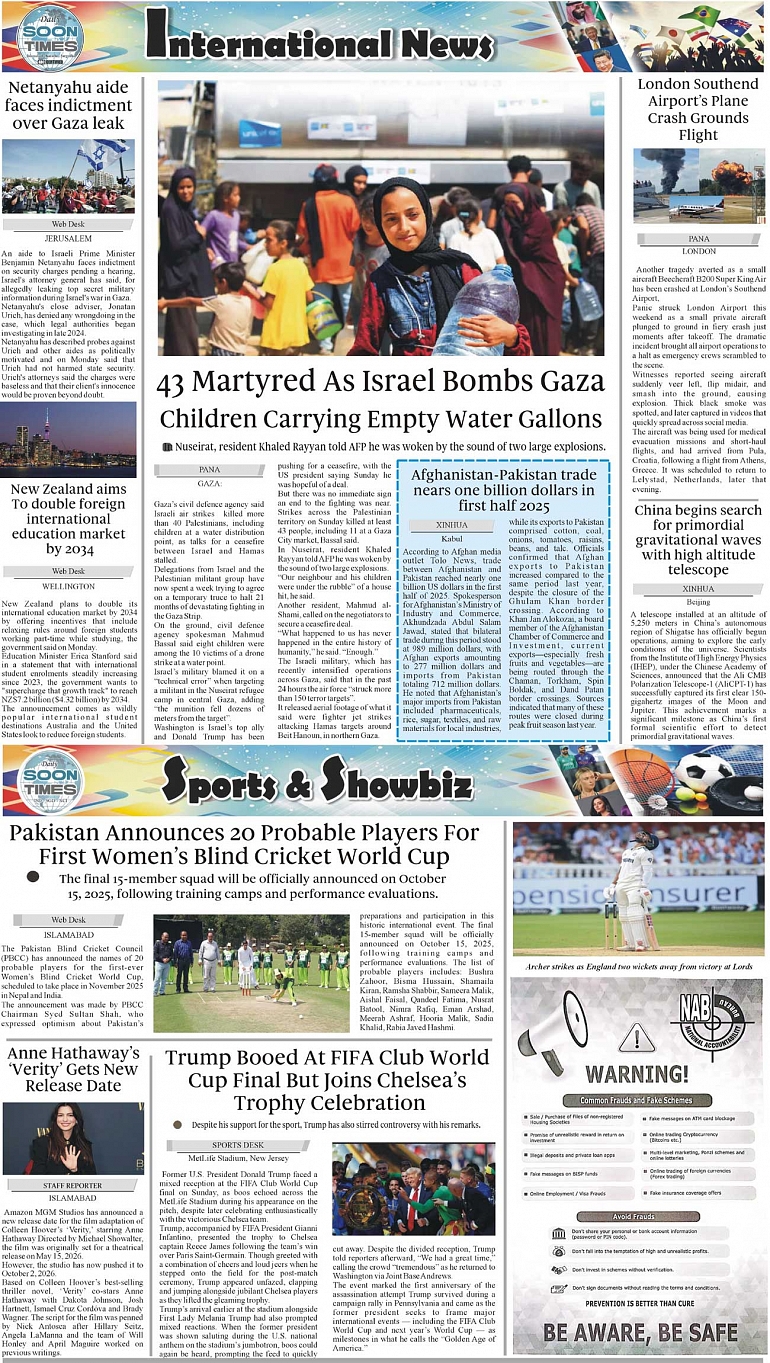 Daily Soon Times Page: 4 July 15, 2025 Daily Soon Times today's ePaper leading English national newspaper from Islamabad, Sargodha, Karachi, Pakistan << First << 4 >> Last >> Page 1Page 2Page 3Page 4 × Daily Soon Times 1234 1234 4