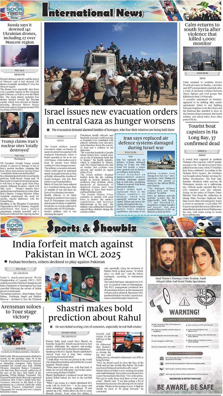 Daily Soon Times Page: 4 July 21, 2025 Daily Soon Times today's ePaper leading English national newspaper from Islamabad, Sargodha, Karachi, Pakistan << First << 4 >> Last >> Page 1Page 2Page 3Page 4 × Daily Soon Times 1k23k4 1k23k4 4