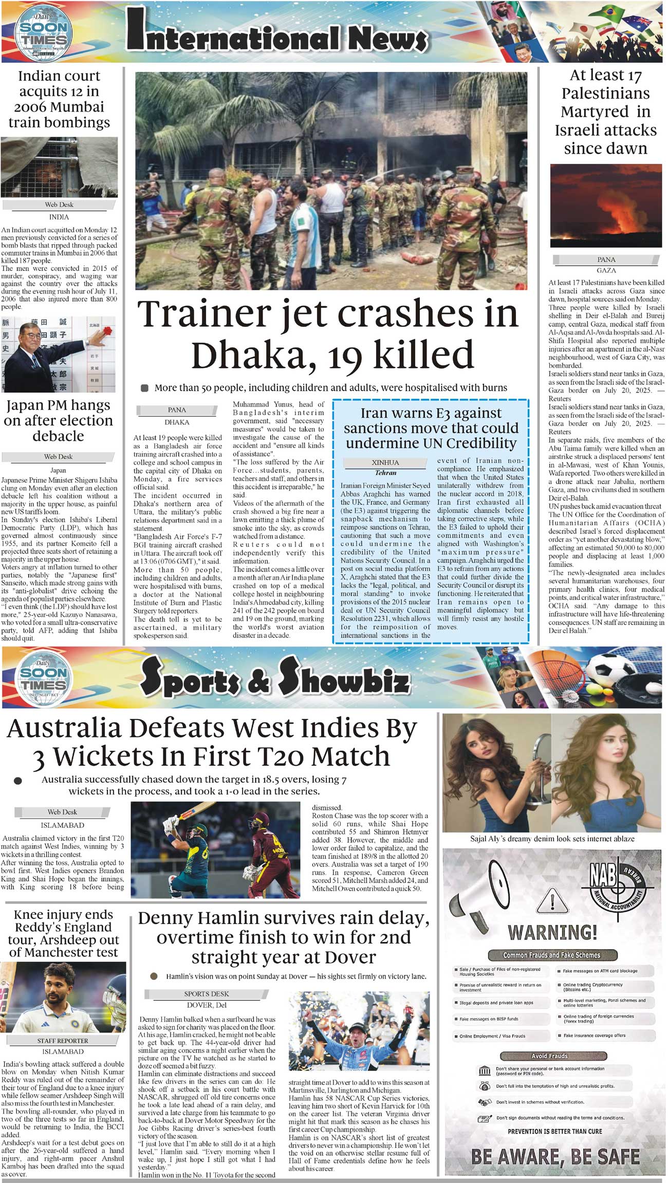 Daily Soon Times Page: 4 July 22, 2025 Daily Soon Times today's ePaper leading English national newspaper from Islamabad, Sargodha, Karachi, Pakistan << First << 4 >> Last >> Page 1Page 2Page 3Page 4 × Daily Soon Times 1234 1234 4