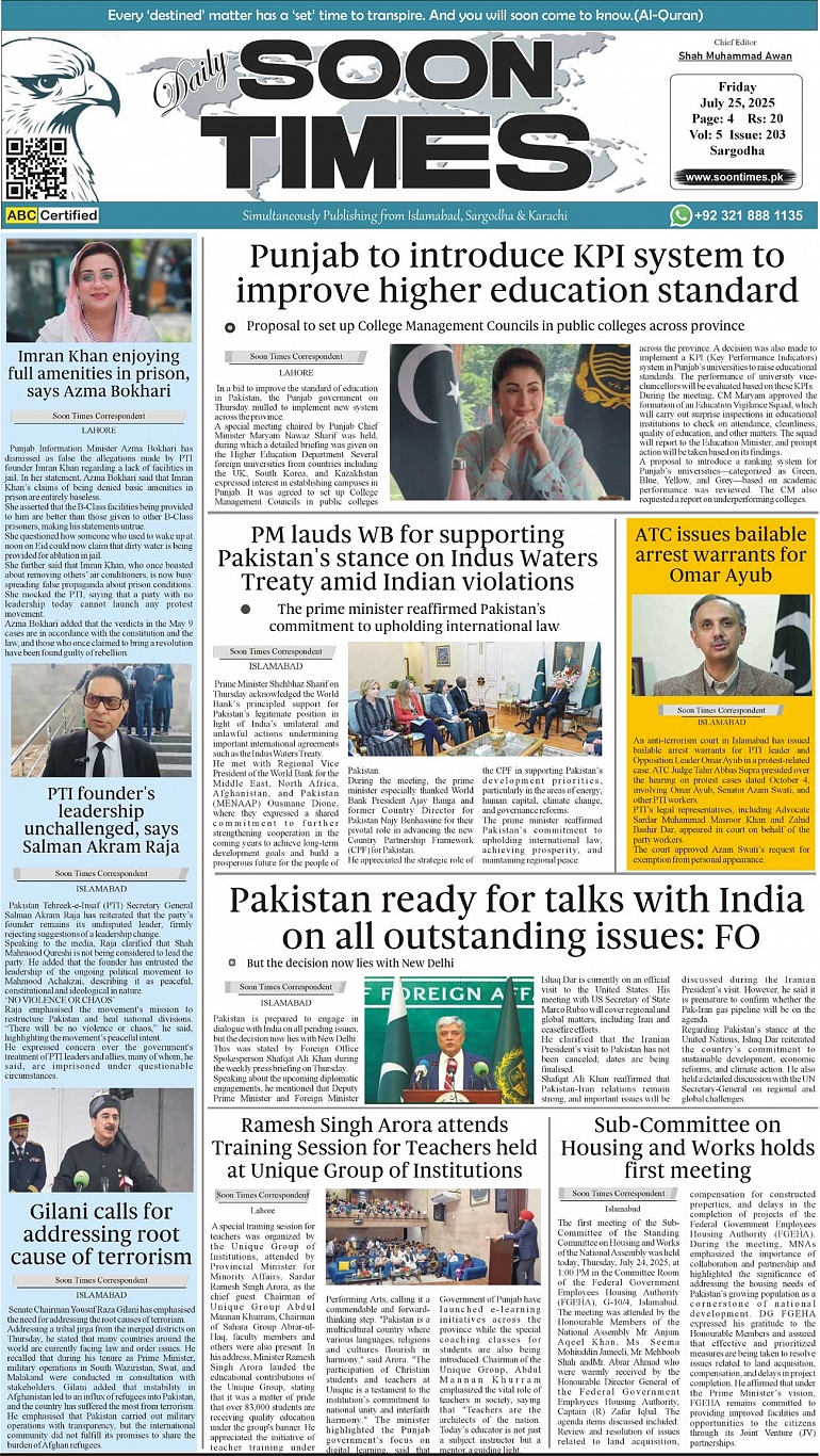 Daily Soon Times July 25, 2025 Daily Soon Times today's ePaper leading English national newspaper from Islamabad, Sargodha, Karachi, Pakistan << First << 1 >> Last >> Page 1Page 2Page 3Page 4 × Daily Soon Times 1234 1234 1