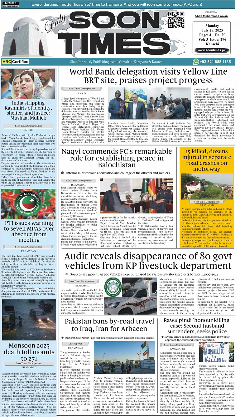 Daily Soon Times July 28, 2025 Daily Soon Times today's ePaper leading English national newspaper from Islamabad, Sargodha, Karachi, Pakistan << First << 1 >> Last >> Page 1Page 2Page 3Page 4 × Daily Soon Times 1k23k4 1k23k4 1k