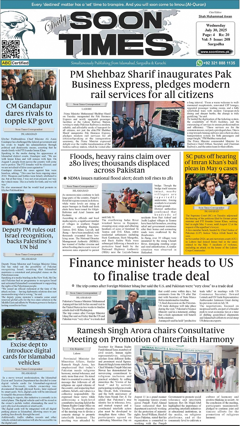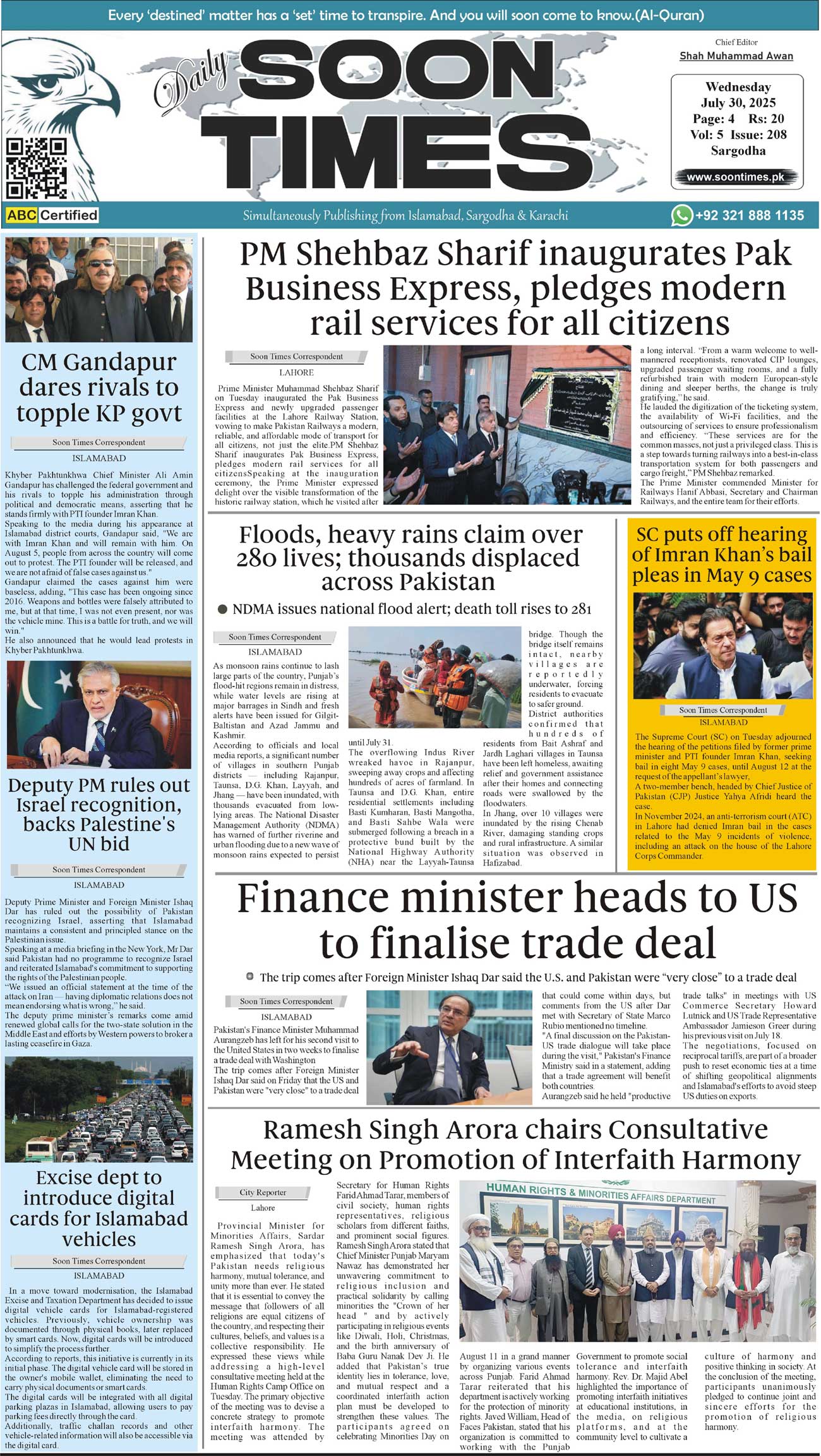 Daily Soon Times July 30, 2025 Daily Soon Times today's ePaper leading English national newspaper from Islamabad, Sargodha, Karachi, Pakistan << First << 1 >> Last >> Page 1Page 2Page 3Page 4 × Daily Soon Times 1234 1234 1