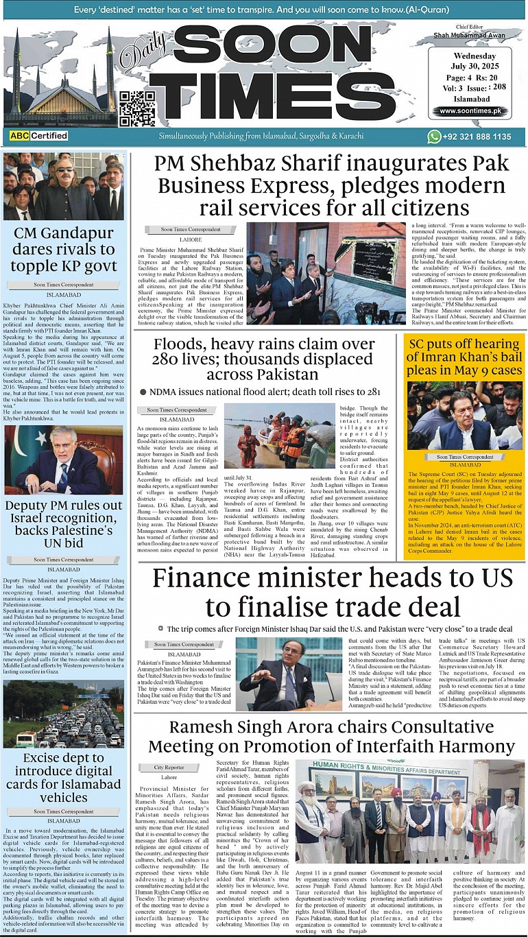 Daily Soon Times July 30, 2025 Daily Soon Times today's ePaper leading English national newspaper from Islamabad, Sargodha, Karachi, Pakistan << First << 1 >> Last >> Page 1Page 2Page 3Page 4 × Daily Soon Times 1.234 1.234 1.