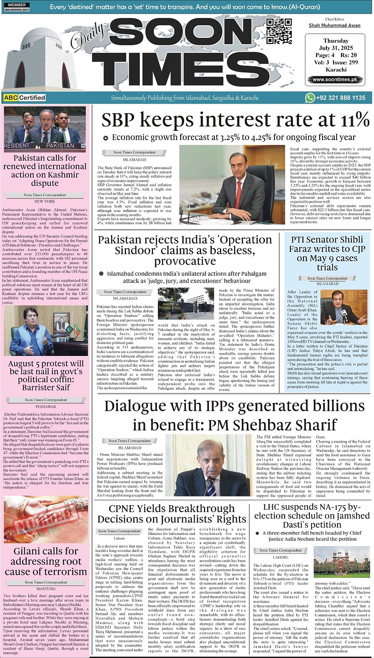 Daily Soon Times today's ePaper leading English national newspaper from Islamabad, Sargodha, Karachi, Pakistan