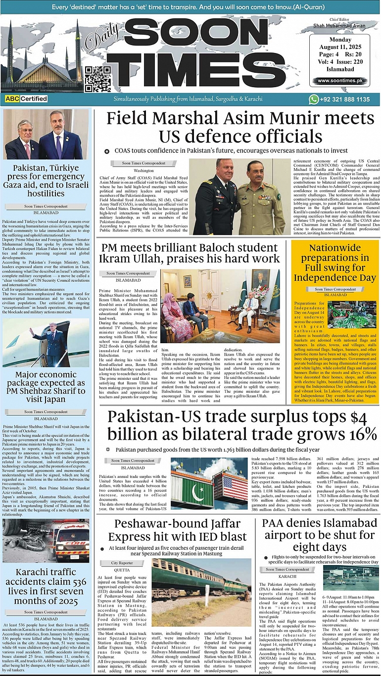 Daily Soon Times today's ePaper leading English national newspaper from Islamabad, Sargodha, Karachi, Pakistan