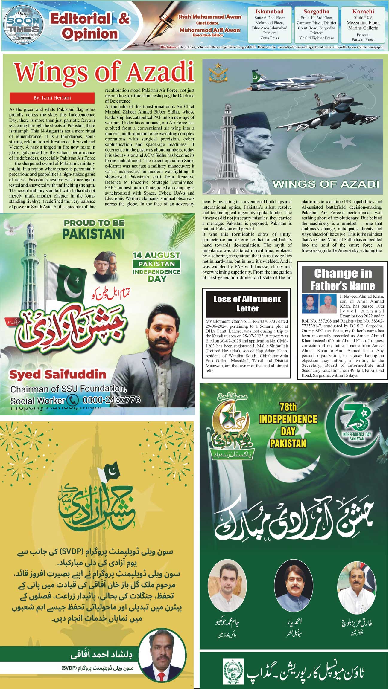 Daily Soon Times Page: 2 August 14, 2025 Daily Soon Times today's ePaper leading English national newspaper from Islamabad, Sargodha, Karachi, Pakistan << First << 2 >> Last >> Page 1Page 2Page 3Page 4 × Daily Soon Times 1.2k3k4 1.2k3k4 2k