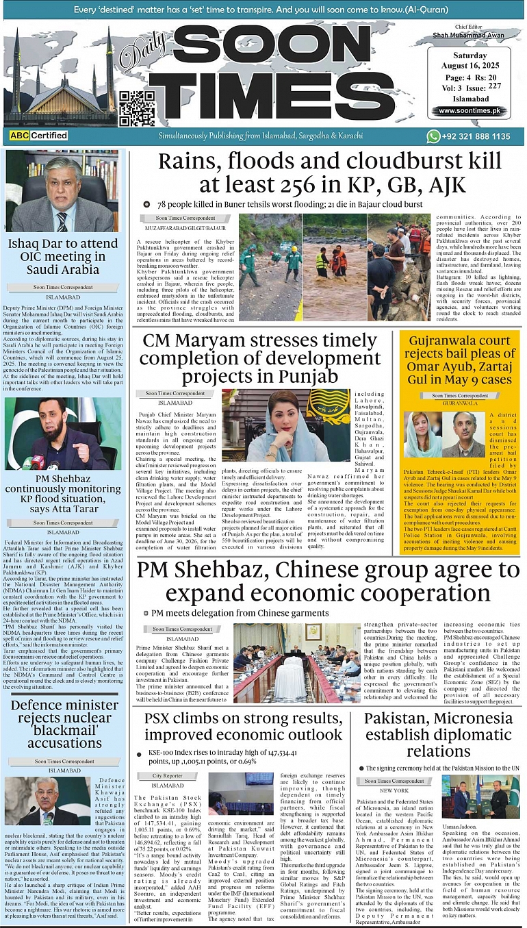 Daily Soon Times August 16, 2025 Daily Soon Times today's ePaper leading English national newspaper from Islamabad, Sargodha, Karachi, Pakistan << First << 1 >> Last >> Page 1Page 2Page 3Page 4 × Daily Soon Times 1.234 1.234 1.