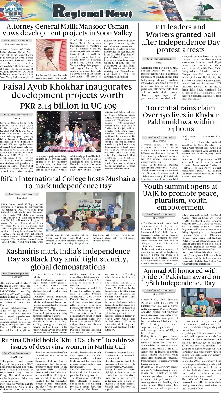 Daily Soon Times Page: 3 August 16, 2025 Daily Soon Times today's ePaper leading English national newspaper from Islamabad, Sargodha, Karachi, Pakistan << First << 3 >> Last >> Page 1Page 2Page 3Page 4 × Daily Soon Times 1234 1234 3