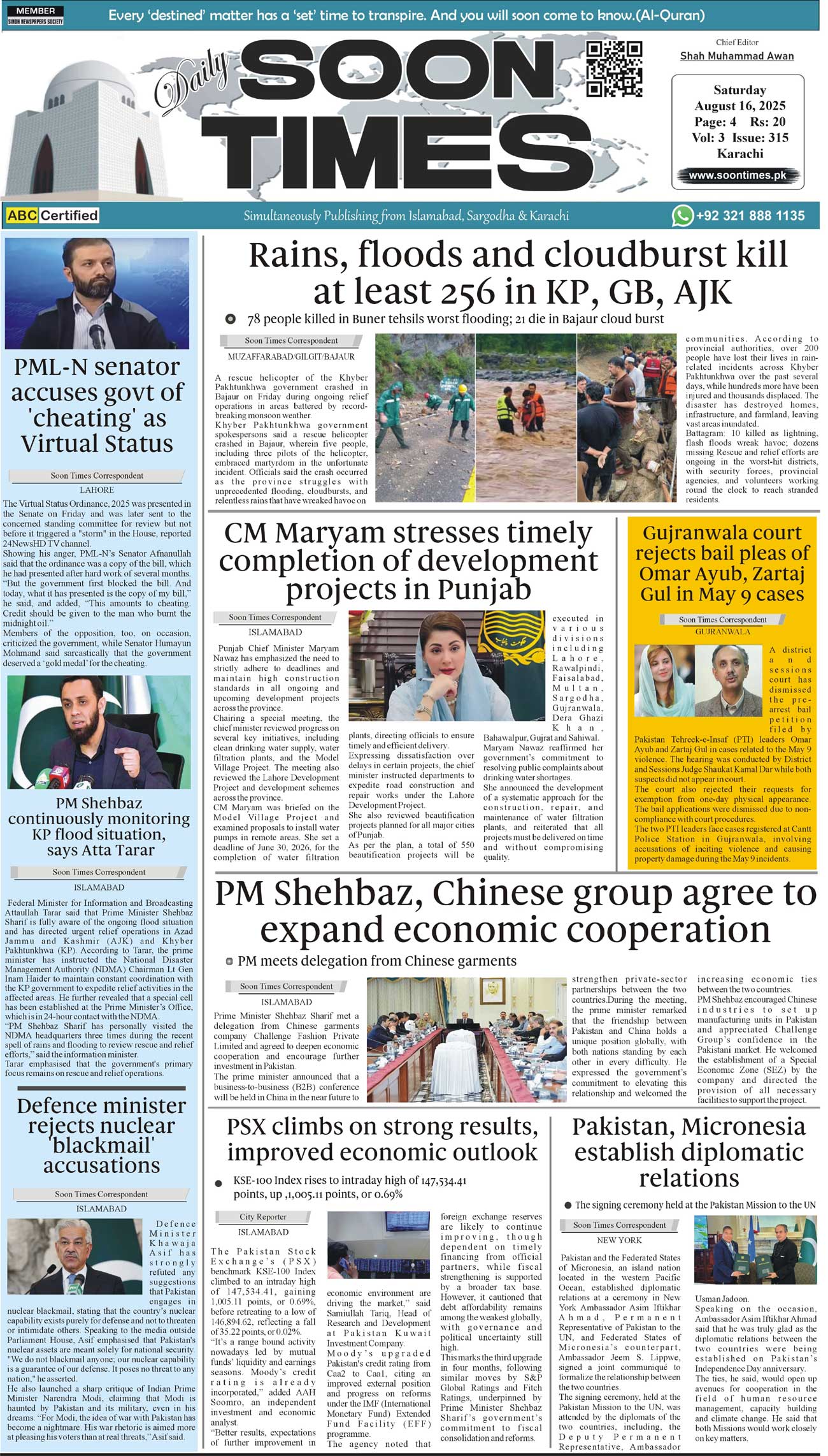 Daily Soon Times August 16, 2025 Daily Soon Times today's ePaper leading English national newspaper from Islamabad, Sargodha, Karachi, Pakistan << First << 1 >> Last >> Page 1Page 2Page 3Page 4 × Daily Soon Times 1k23k4 1k23k4 1k