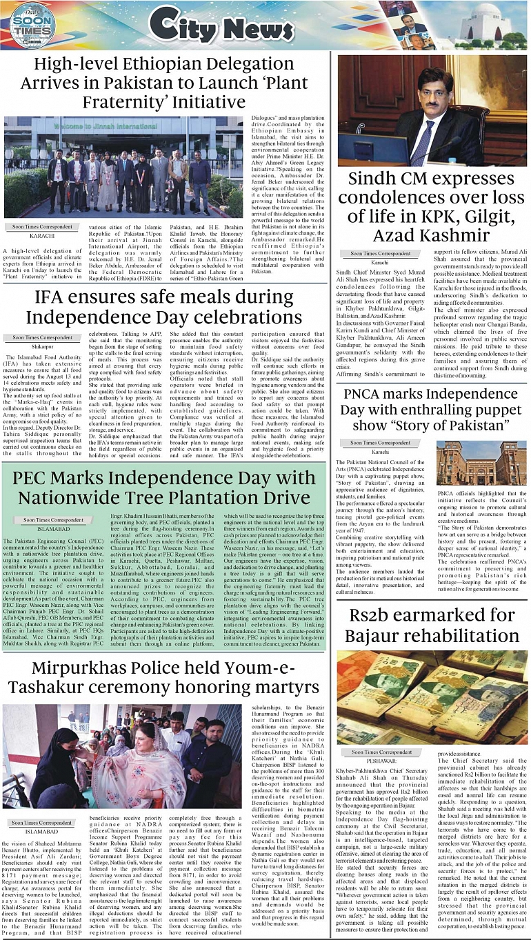 Daily Soon Times Page: 3 August 16, 2025 Daily Soon Times today's ePaper leading English national newspaper from Islamabad, Sargodha, Karachi, Pakistan << First << 3 >> Last >> Page 1Page 2Page 3Page 4 × Daily Soon Times 1k23k4 1k23k4 3k