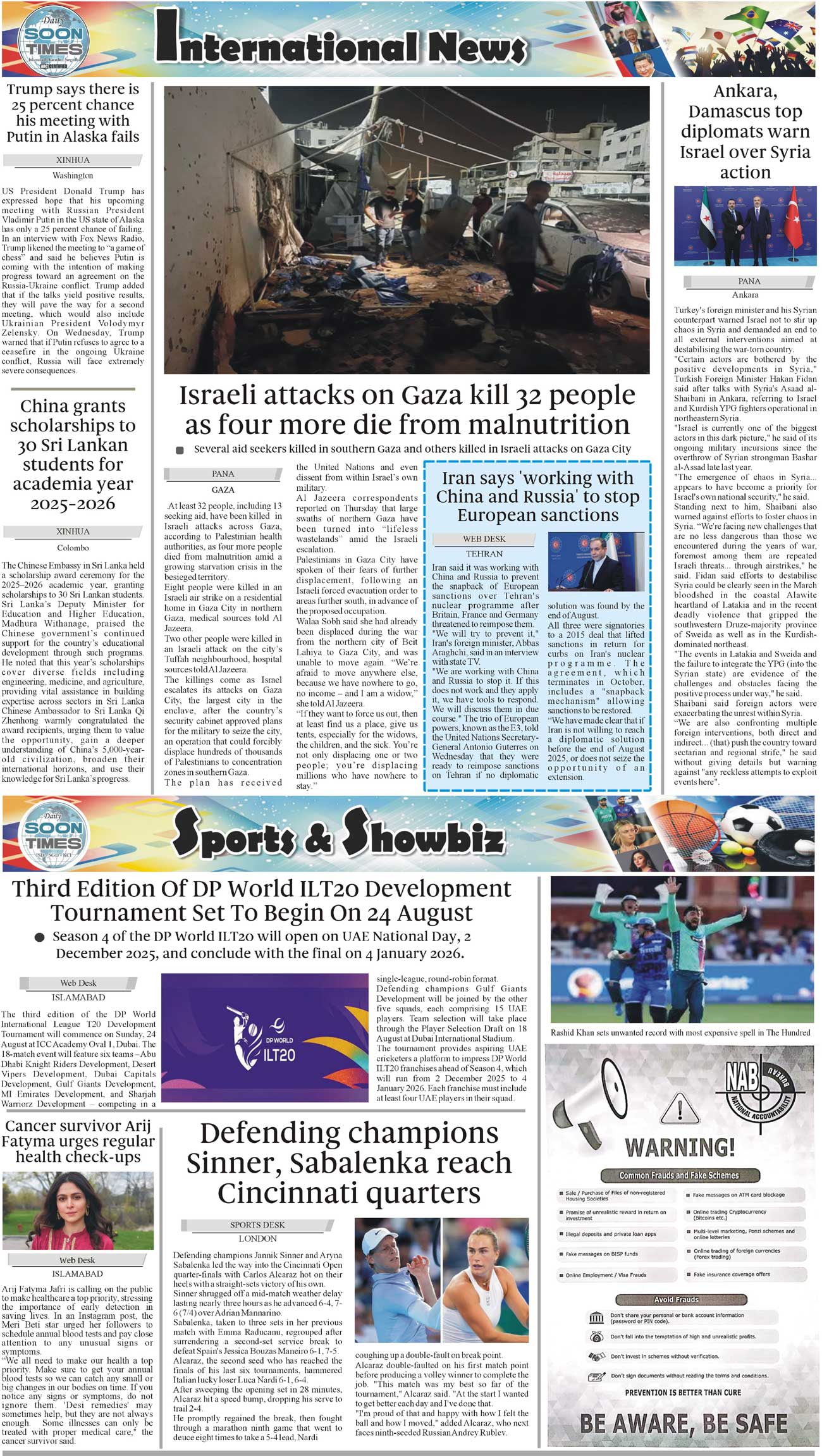 Daily Soon Times Page: 4 August 16, 2025 Daily Soon Times today's ePaper leading English national newspaper from Islamabad, Sargodha, Karachi, Pakistan << First << 4 >> Last >> Page 1Page 2Page 3Page 4 × Daily Soon Times 1k23k4 1k23k4 4