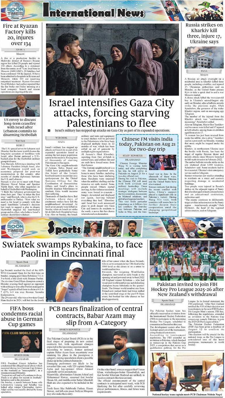 Daily Soon Times Page: 4 August 19, 2025 Daily Soon Times today's ePaper leading English national newspaper from Islamabad, Sargodha, Karachi, Pakistan << First << 4 >> Last >> Page 1Page 2Page 3Page 4 × Daily Soon Times 1234 1234 4