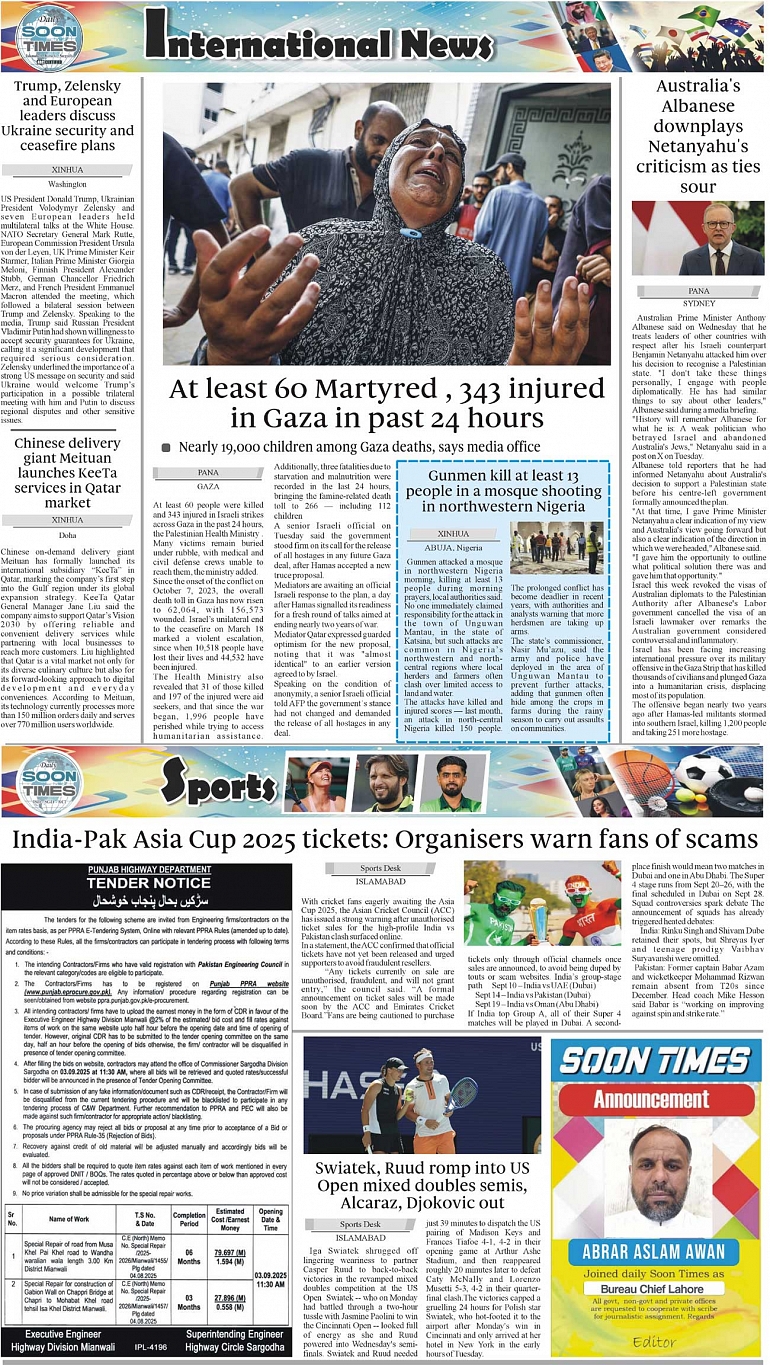 Daily Soon Times Page: 4 August 21, 2025 Daily Soon Times today's ePaper leading English national newspaper from Islamabad, Sargodha, Karachi, Pakistan << First << 4 >> Last >> Page 1Page 2Page 3Page 4 × Daily Soon Times 1.234 1.234 4