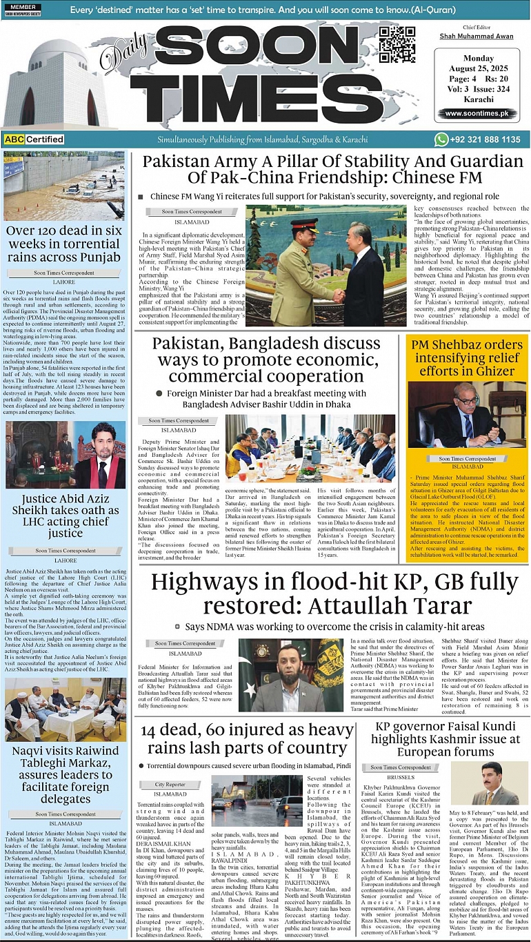 Daily Soon Times today's ePaper leading English national newspaper from Islamabad, Sargodha, Karachi, Pakistan