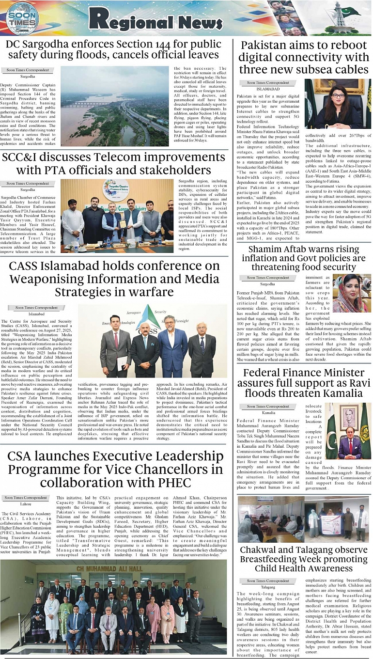 Daily Soon Times Page: 3 August 29, 2025 Daily Soon Times today's ePaper leading English national newspaper from Islamabad, Sargodha, Karachi, Pakistan << First << 3 >> Last >> Page 1Page 2Page 3Page 4 × Daily Soon Times 1234s 1234s 3