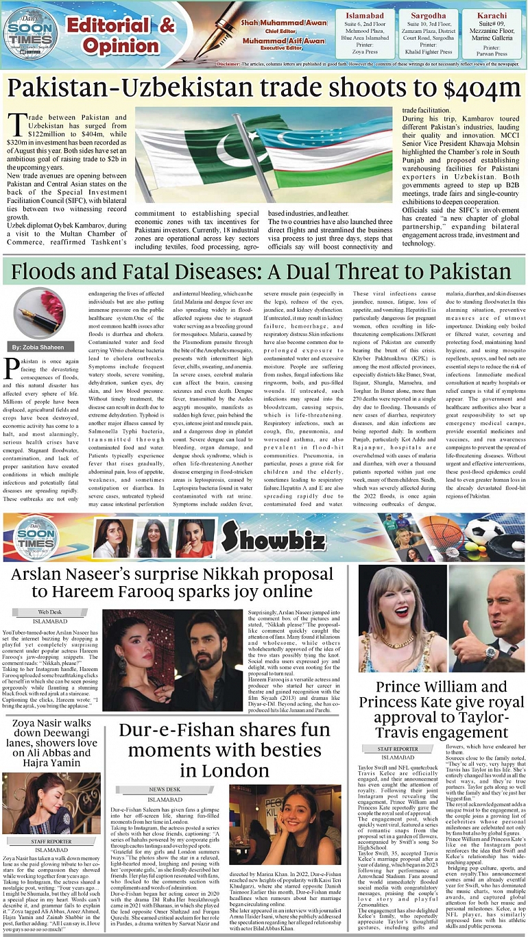 Daily Soon Times Page: 2 August 29, 2025 Daily Soon Times today's ePaper leading English national newspaper from Islamabad, Sargodha, Karachi, Pakistan << First << 2 >> Last >> Page 1Page 2Page 3Page 4 × Daily Soon Times FP-KAR23k4 FP-KAR23k4 2