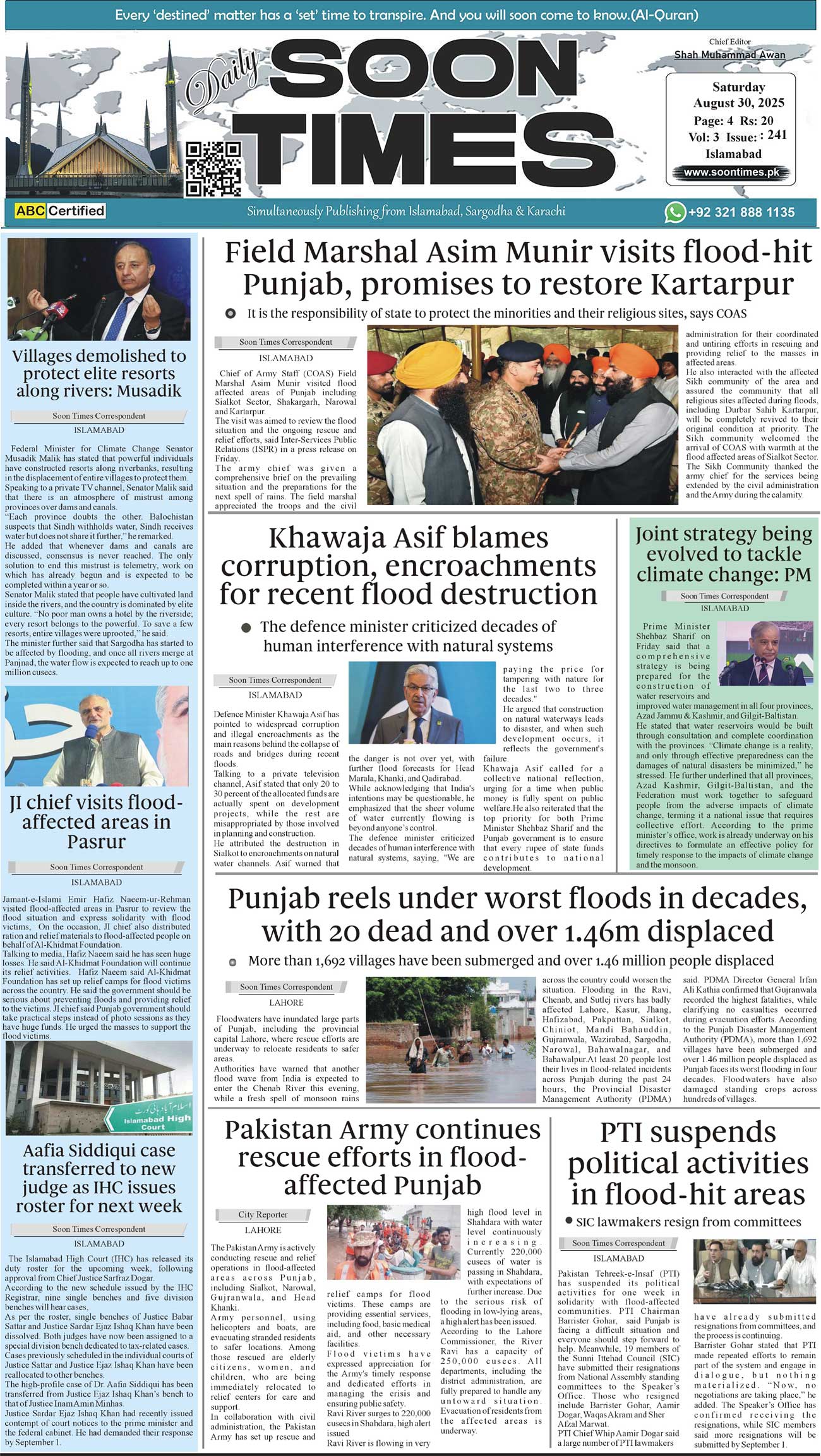 Daily Soon Times August 30, 2025 Daily Soon Times today's ePaper leading English national newspaper from Islamabad, Sargodha, Karachi, Pakistan << First << 1 >> Last >> Page 1Page 2Page 3Page 4 × Daily Soon Times 1.234 1.234 1.