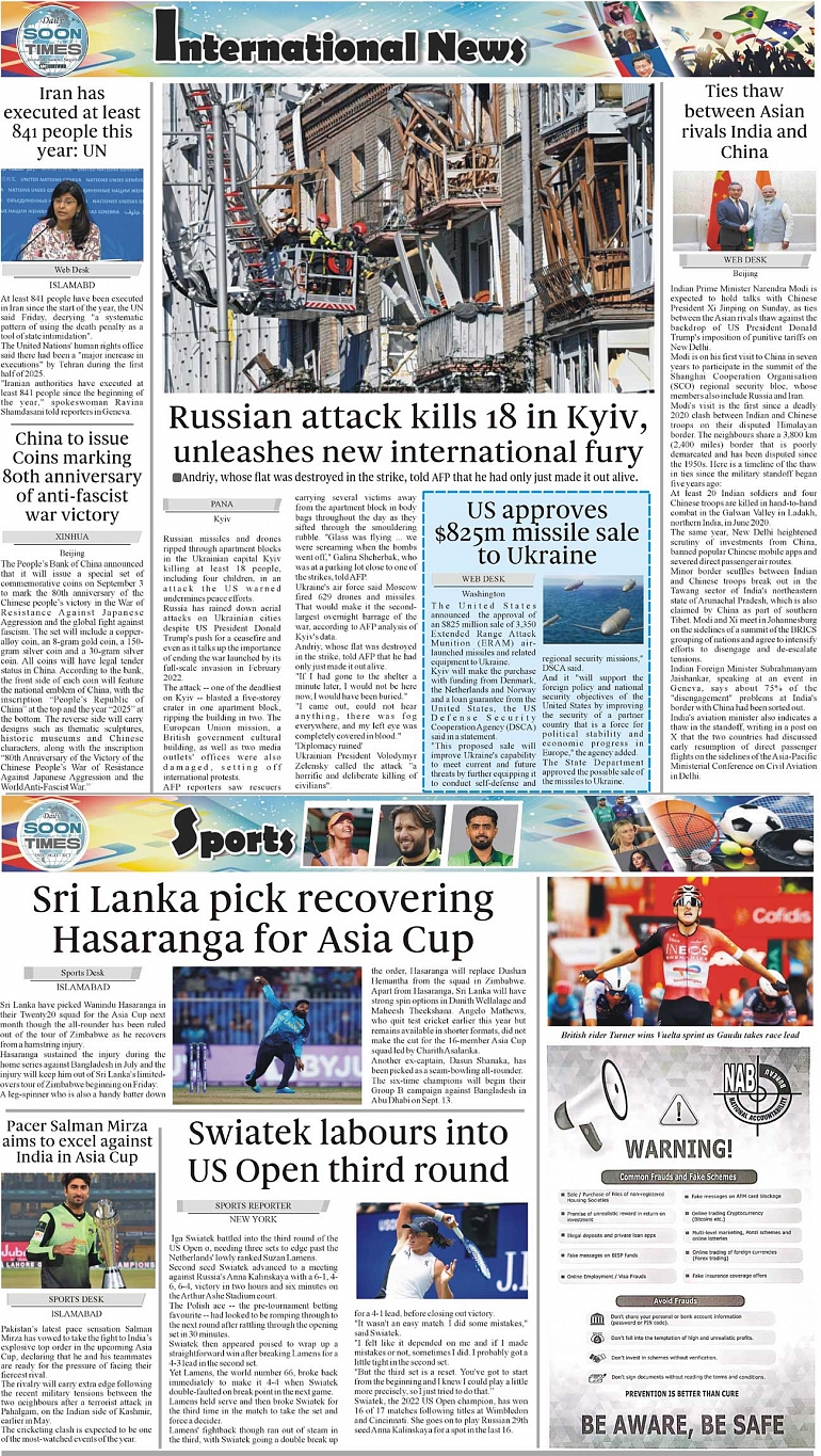 Daily Soon Times Page: 4 August 30, 2025 Daily Soon Times today's ePaper leading English national newspaper from Islamabad, Sargodha, Karachi, Pakistan << First << 4 >> Last >> Page 1Page 2Page 3Page 4 × Daily Soon Times 1k23k4 1k23k4 4