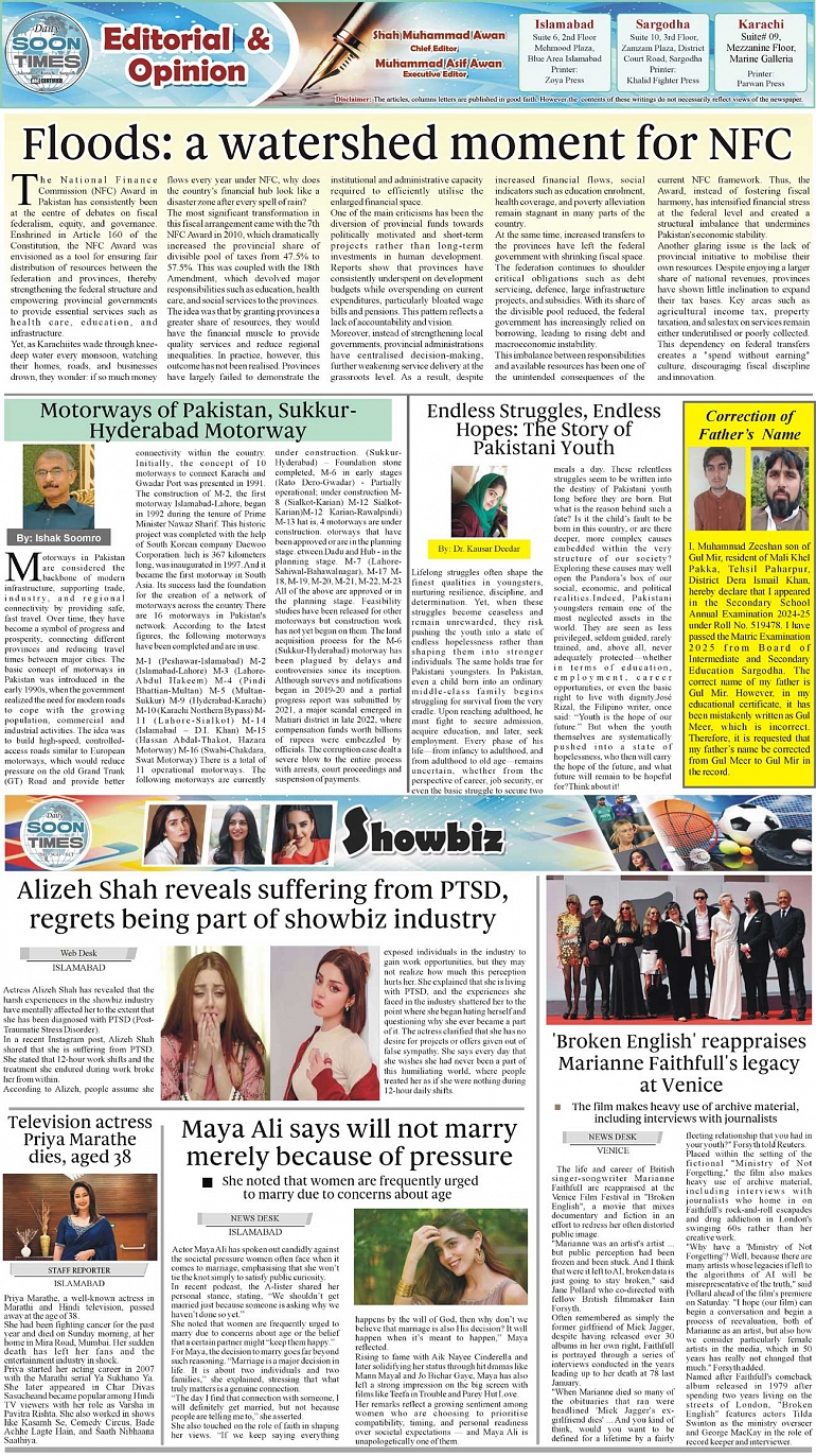 Daily Soon Times Page: 2 September 02, 2025 Daily Soon Times today's ePaper leading English national newspaper from Islamabad, Sargodha, Karachi, Pakistan << First << 2 >> Last >> Page 1Page 2Page 3Page 4 × Daily Soon Times 1234 1234 2