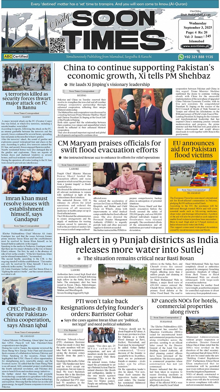Daily Soon Times September 03, 2025 Daily Soon Times today's ePaper leading English national newspaper from Islamabad, Sargodha, Karachi, Pakistan << First << 1 >> Last >> Page 1Page 2Page 3Page 4 × Daily Soon Times 1.234 1.234 1.