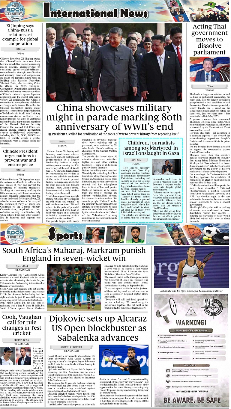 Daily Soon Times Page: 4 September 04, 2025 Daily Soon Times today's ePaper leading English national newspaper from Islamabad, Sargodha, Karachi, Pakistan << First << 4 >> Last >> Page 1Page 2Page 3Page 4 × Daily Soon Times 1234 1234 4