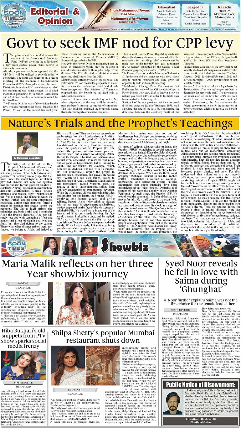 Daily Soon Times Page: 2 September 05, 2025 Daily Soon Times today's ePaper leading English national newspaper from Islamabad, Sargodha, Karachi, Pakistan << First << 2 >> Last >> Page 1Page 2Page 3Page 4 × Daily Soon Times 1kP23k4 1kP23k4 P2